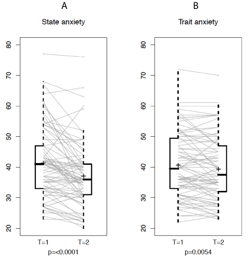 Overall, the mean decrease for state anxiety was 4.3 (p<0.0001) and 1.2 for trait anxiety (p=0.01). The 2nd STAI questionnaire, submitted after the 1st interview, showed a modest reduction in the level of trait anxiety (-1.2 overall, p=0.0054) and an important reduction in state anxiety (-4.3 overall, p<0.0001) (Figure 1). The correlation between the reduction of both state and trait anxiety was statistically significant p=0.0009, ρ 0.36.
