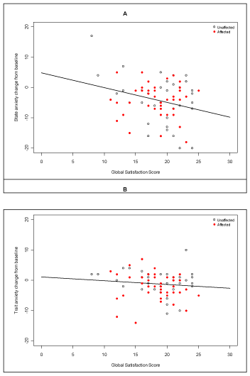 Higher levels of satisfaction were associated with higher levels of state anxiety reduction (ρ=-0.23, p=0.03) but not with higher levels of trait anxiety reduction (ρ=-0.08, p=0.42) (Figure 2).