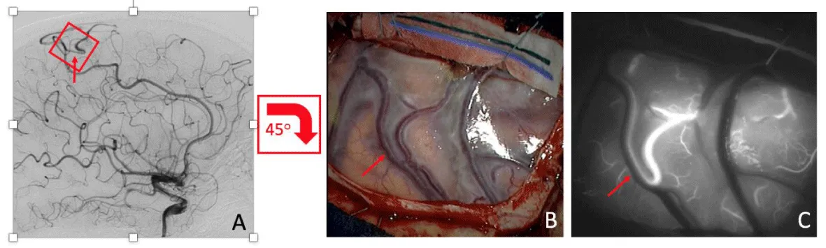 In case of surgical removal of the micro-AVM we routinely used MRI neuronavigation to plan the craniotomy and to localize the nidus. ICG-VA was used to map the angioarchitecture of the AVM before resection and to rule out the presence of residual early venous drainage post resection in all cases. A bolus of 25 mg ICG in 5 mL of saline was administered intravenously by the anesthesiologist. We used the IR800 module provided with the Zeiss Pentero operating microscope (Zeiss, Germany).