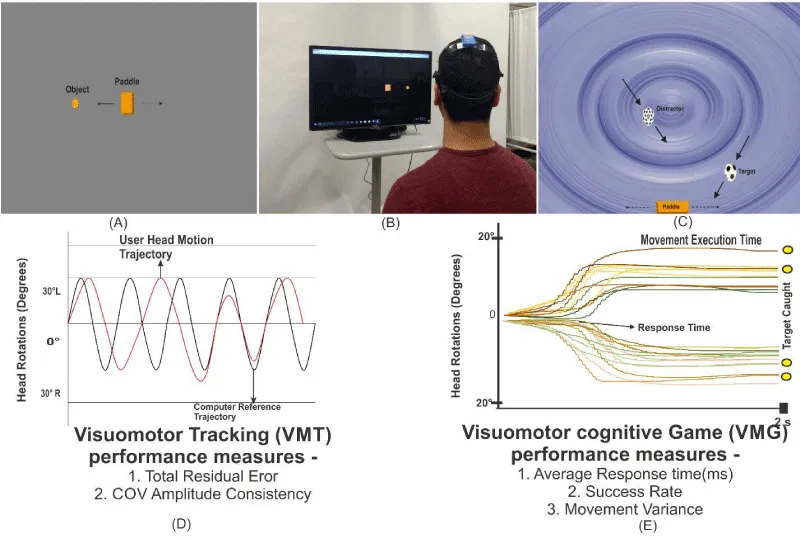 The VCG module as shown in Figure 1C, was for the purpose of moving a game paddle horizontally via head rotation horizontally to interact with the moving game objects. The game objects were categorized as designated targets or designated distractors. The game objects appear at random locations at the top of the display every 2 seconds and moved to the bottom of the display. Participants responded by moving the game paddle to catch the target objects while avoiding the distractors. Two different difficulty levels were used; VCG1, here the trajectories of the game objects were vertical and VCG-2, where the targets moved in a diagonal path from top to bottom. A logged data file was generated that synchronously recorded the coordinates of the game paddle and target objects at a sampling rate of 100Hz. Prior to testing, the participants were allowed to play the tracking and game tasks while sitting for a few minutes to become familiar with each task.